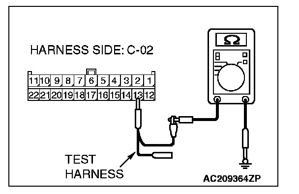 5. Measure the resistance between special tool MB991997 (ASC check harness) connector terminal 13 and body ground.