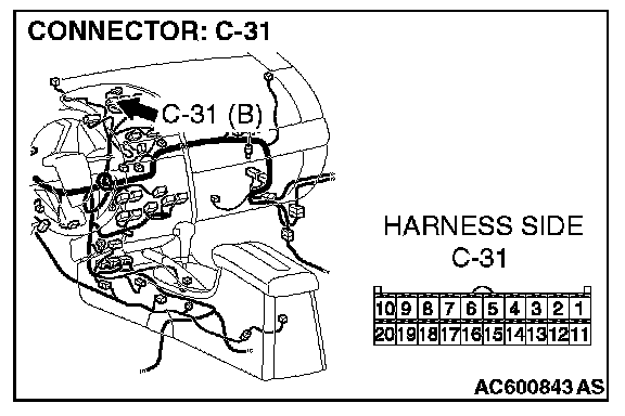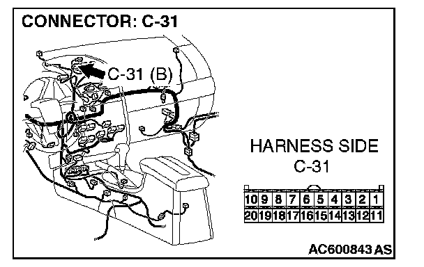 STEP 54. Check multi-center display unit connector C-31 [Mitsubishi Multi Communication System] for loose, corroded or damaged terminals, or terminals pushed back in the connector.