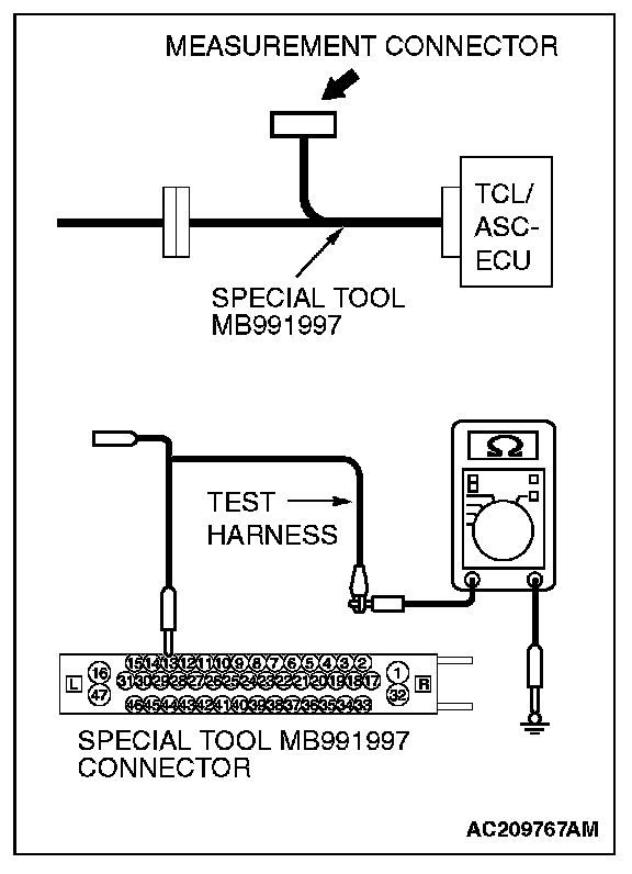 2. Connect special tool MB991997 (ASC check harness) to the TCL/ASC-ECU and the wiring harness, and measure the resistance at special tool MB991997 (ASC check harness).
