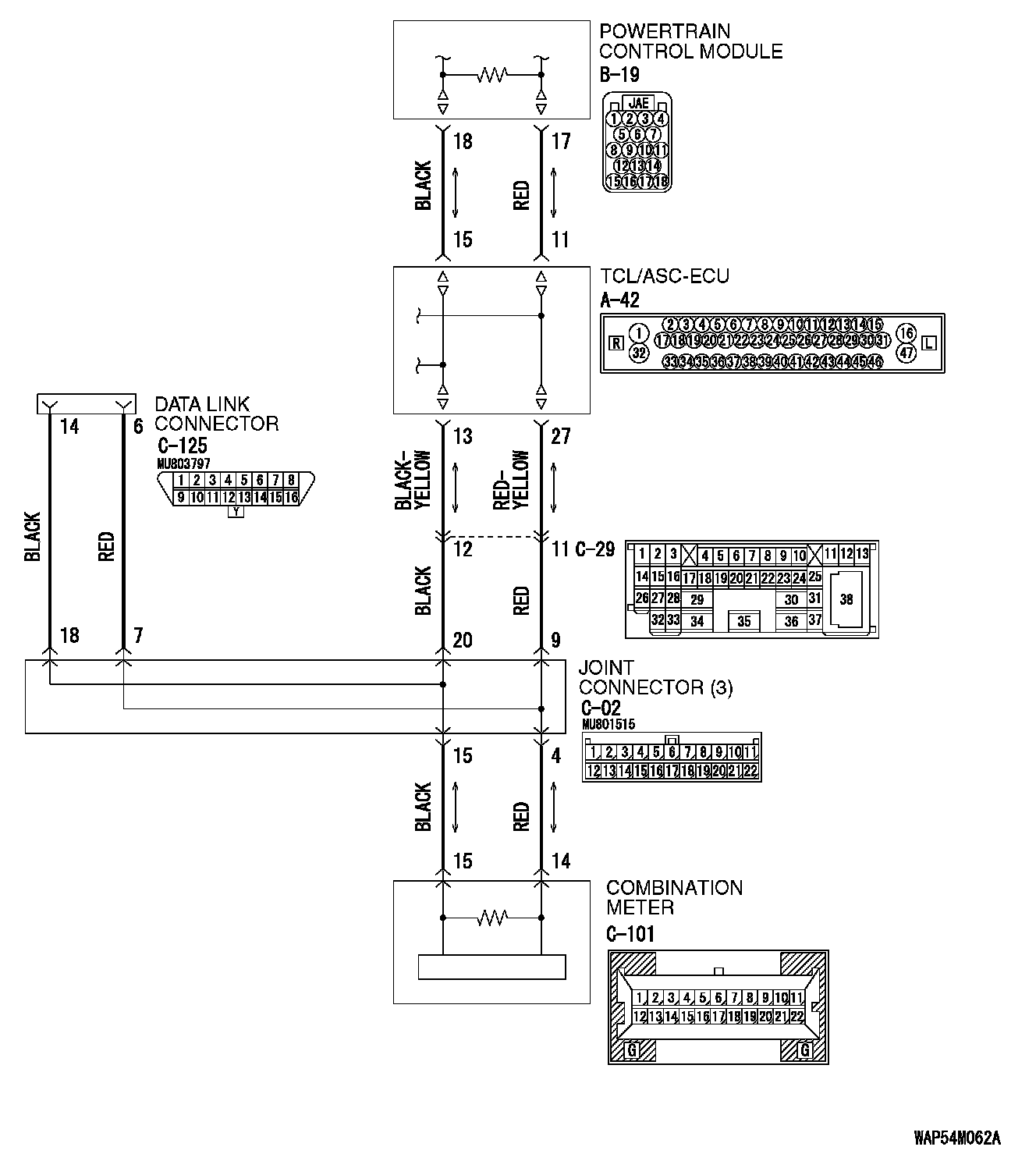 STEP 8. Check the front wiring harness side CAN bus lines (communication line including the powertrain control module and the TCL/ASC-ECU). Measure the resistance at intermediate connector C-29.