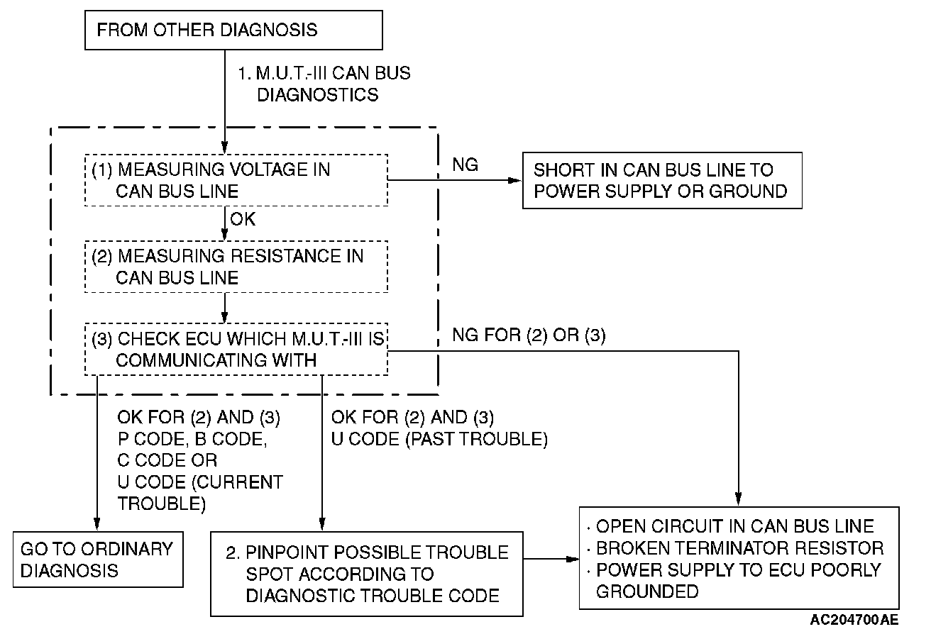 EXPLANATION ABOUT THE SCAN TOOL (M.U.T.-III) CAN BUS DIAGNOSTICSScan tool MB991958 CAN bus diagnostics carries out the three checks below automatically, and then displays the current condition of the CAN bus lines according to the check results.