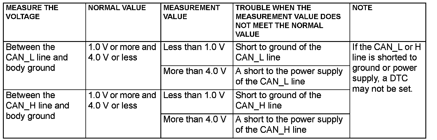 Diagnoses the power supply (such as wires of higher voltage than CAN communication line) and grounding (such as wires of lower voltage than CAN communication line) of CAN bus lines for short circuit by measuring the voltages between the CAN_L line or H line and body ground.