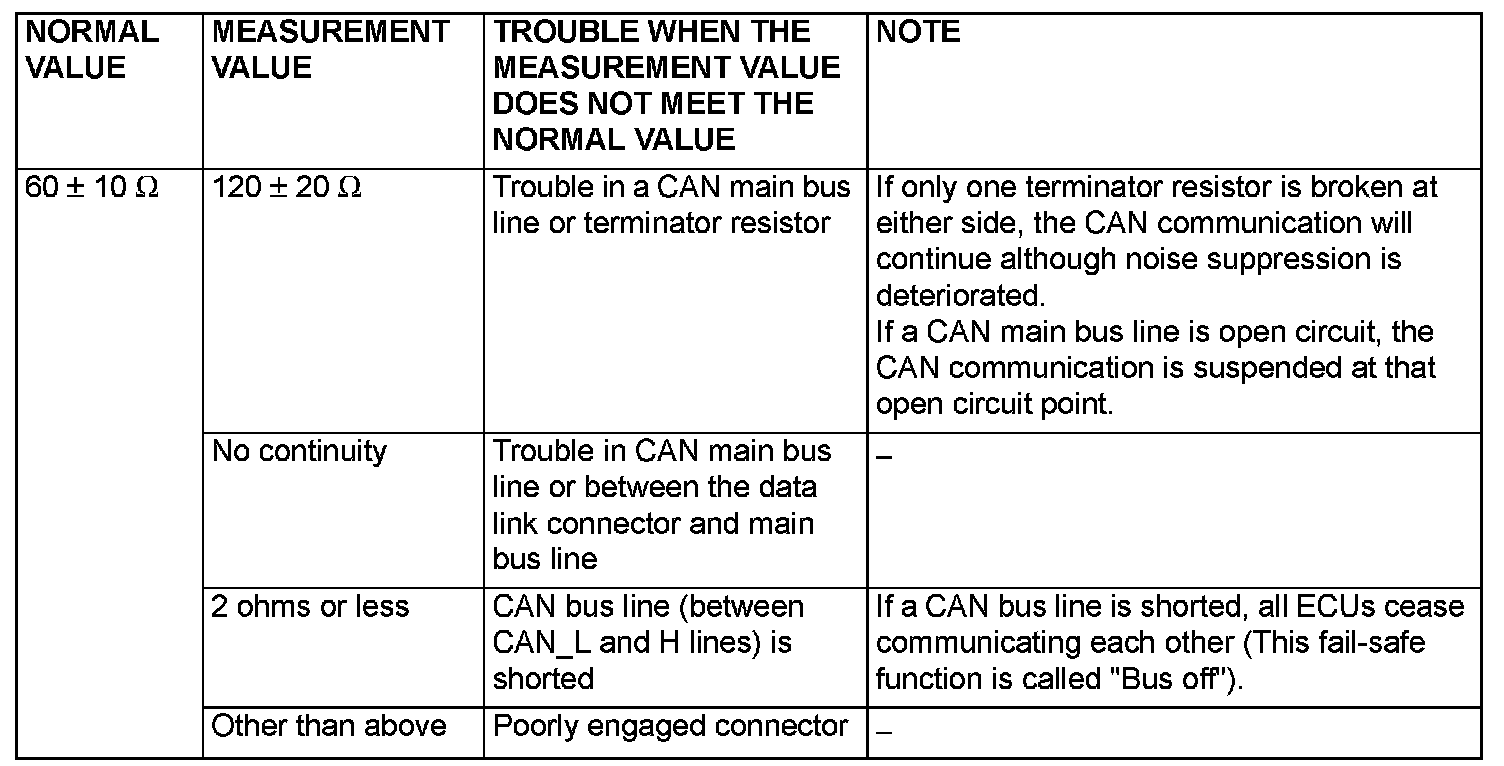 Checks the terminator resistors (incorporated in the combination meter or the powertrain control module), which are connected to each end of a CAN bus line, for breakage and a CAN bus main line for open circuit by measuring the resistance value between a CAN_L line and H line.