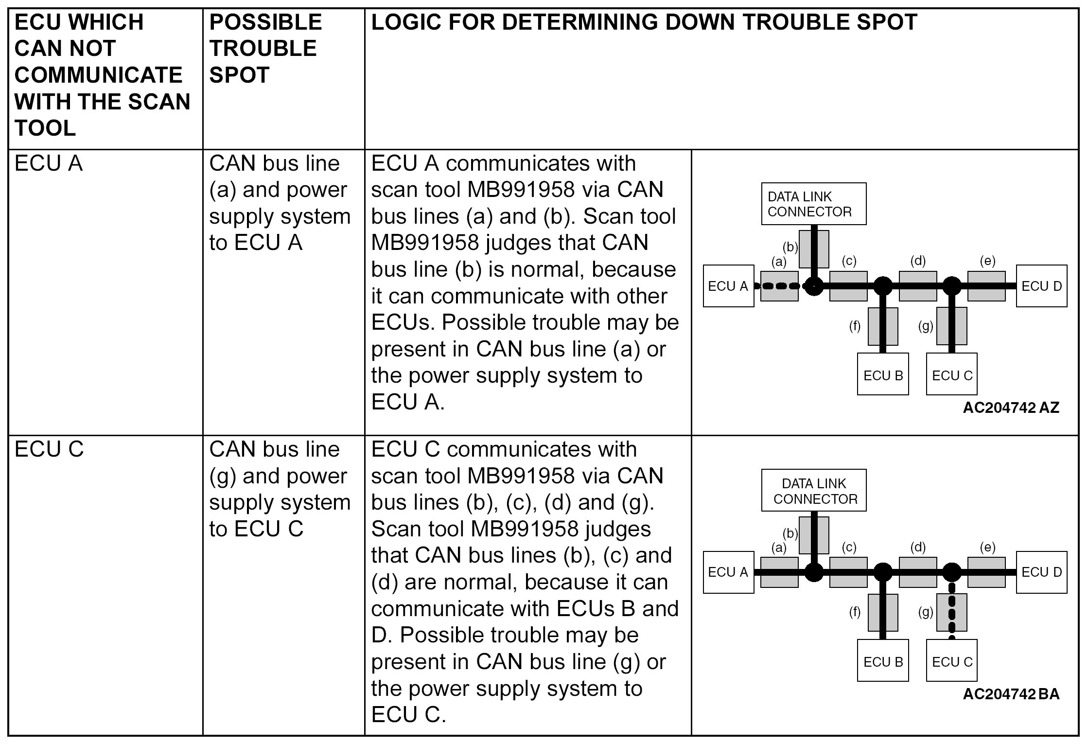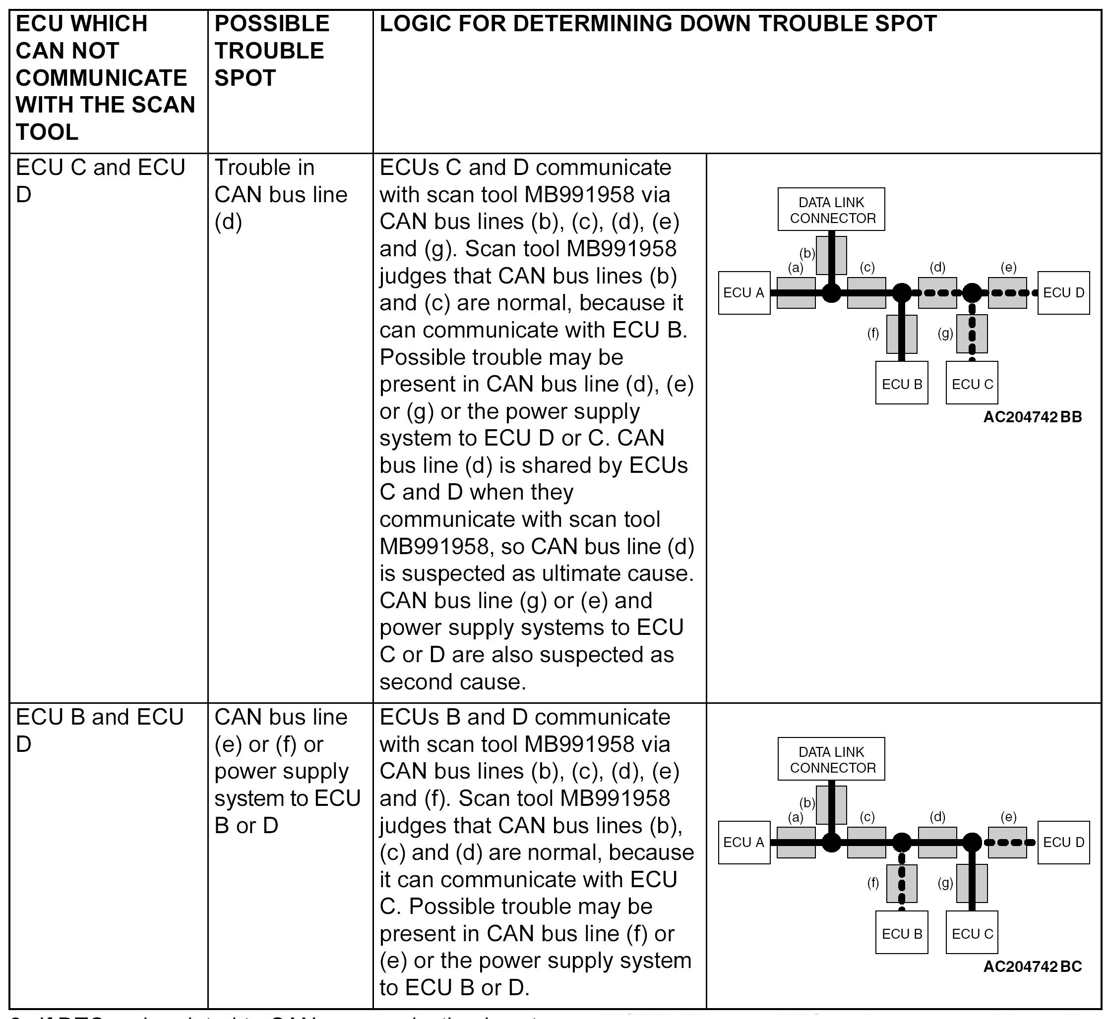 Scan tool MB991958 diagnoses CAN bus lines in accordance with the following strategy.