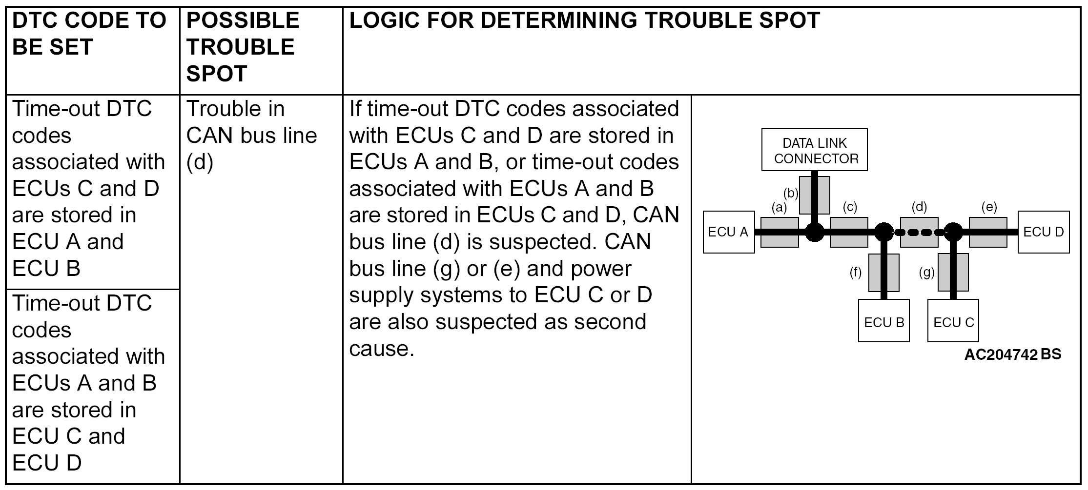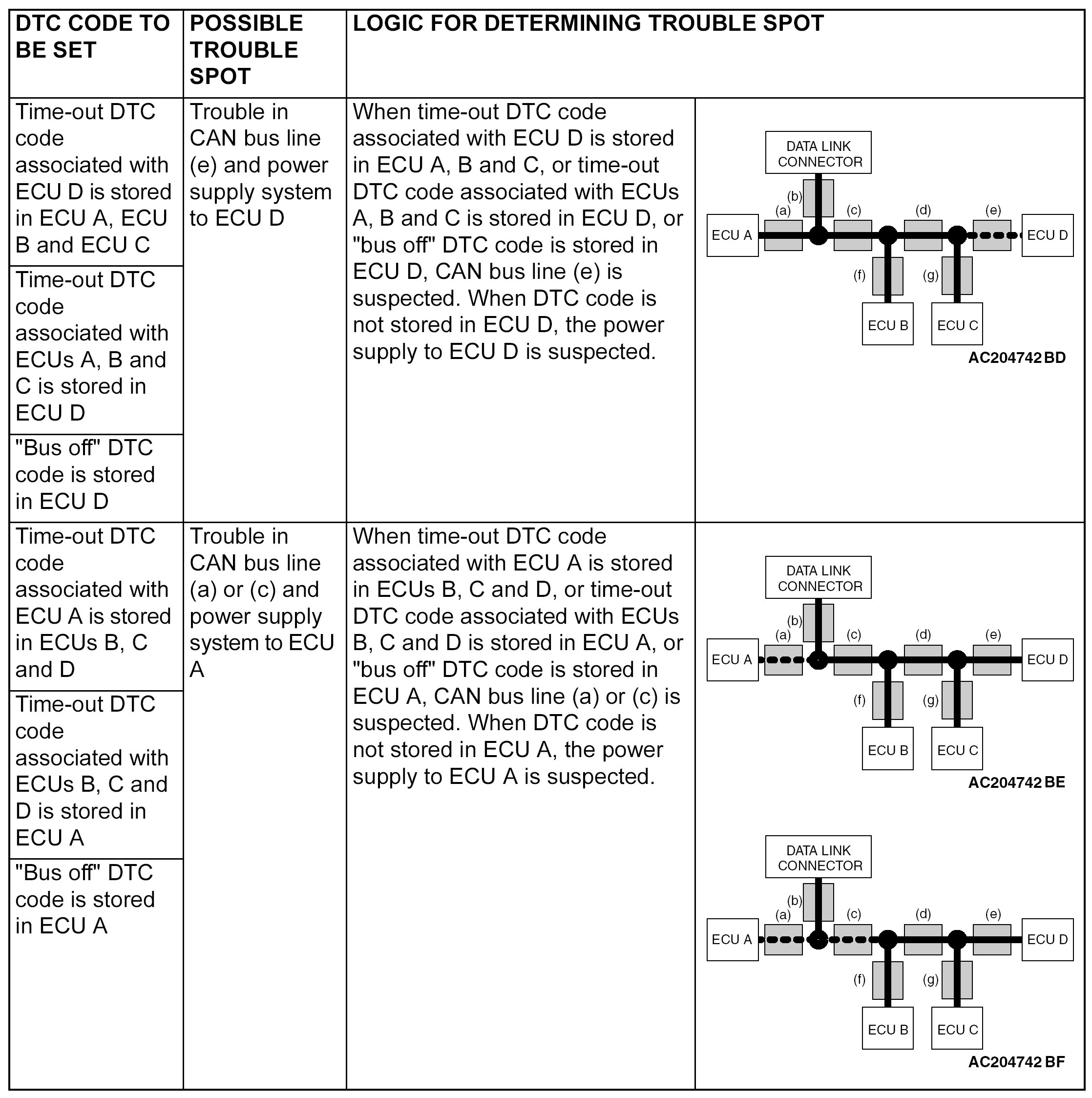 - Time-out DTC codes are stored in each ECU memory individually. Therefore, it is possible that these DTC codes have not been set simultaneously. If the trouble spot cannot be found when you diagnose by judging from multiple DTC codes, check the communication lines between each ECU.