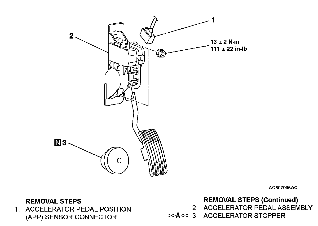 - Do not remove the accelerator pedal pad. If the pad is removed and installed, excessive force may damage accelerator pedal position sensor.