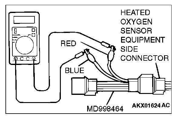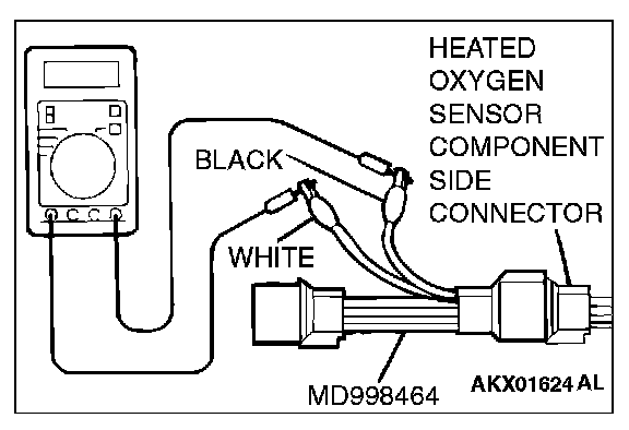 1. Disconnect the heated oxygen sensor connector and connect special tool MD998464 to the connector on the heated oxygen sensor side.