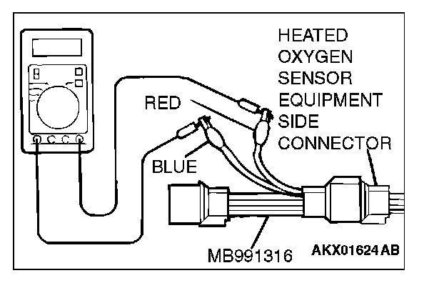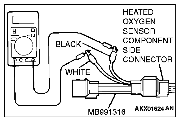 1. Disconnect the heated oxygen sensor connector and connect special tool MB991316 to the connector on the heated oxygen sensor side.