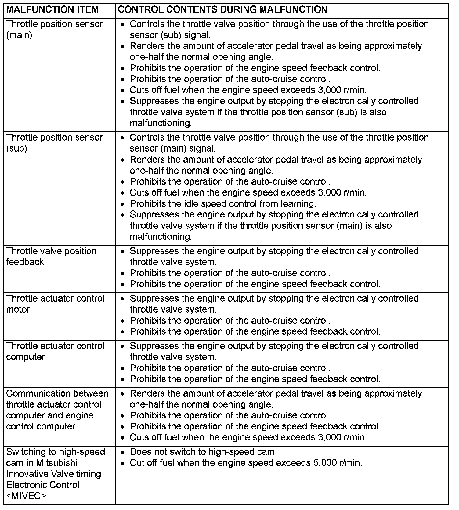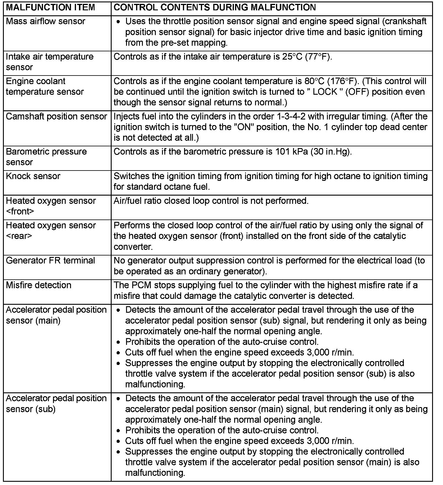 When the main sensor malfunctions are detected by the diagnostic test mode, the vehicle is controlled by means of the following defaults.
