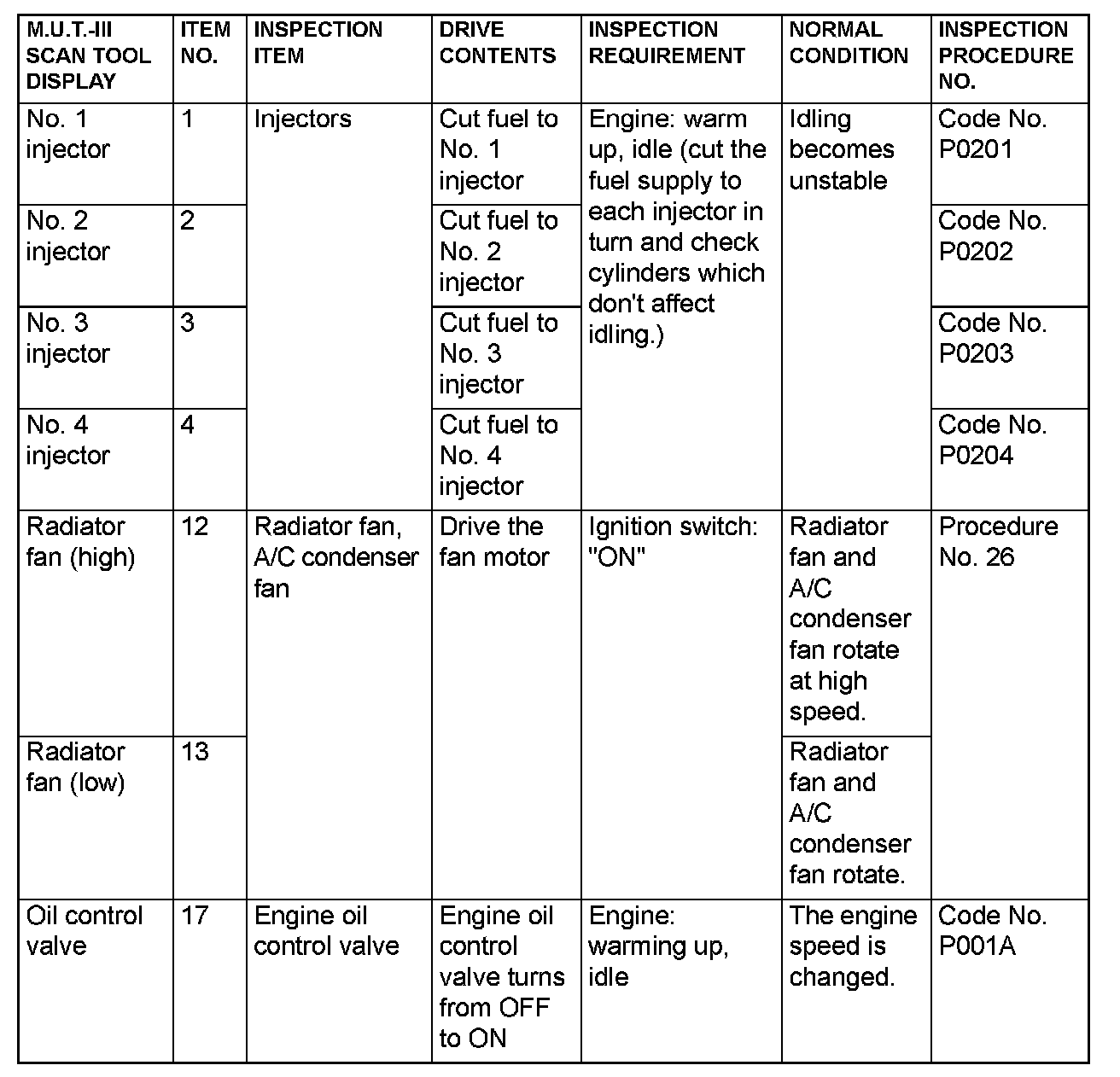 Actuator Test Reference Table