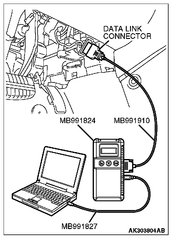 CAUTION: To prevent damage to scan tool MB991958, always turn the ignition switch to the "LOCK" (OFF) position before connecting or disconnecting scan tool MB991958.