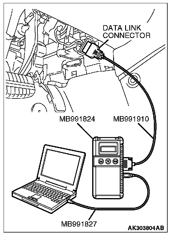 CAUTION: To prevent damage to scan tool MB991958, always turn the ignition switch to the "LOCK" (OFF) position before connecting or disconnecting scan tool MB991958.