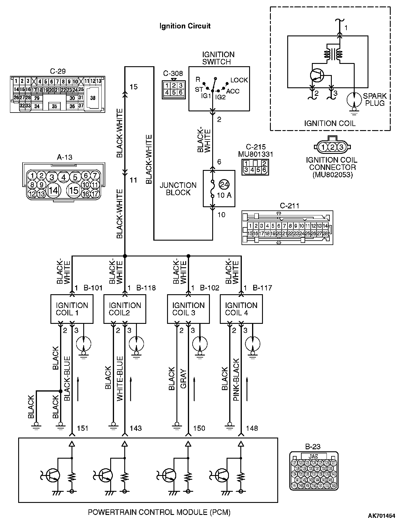 a. Check the harness wire between ignition coil connector B-101 (terminal No. 3) and PCM connector B-23 (terminal No. 151) at ignition coil 1.