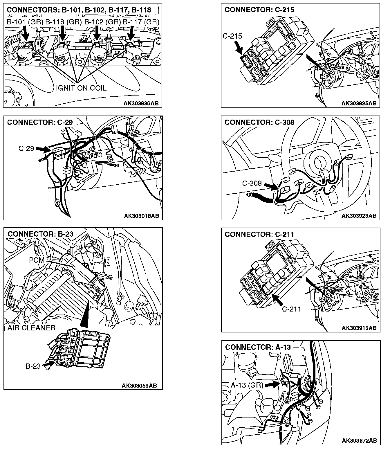 STEP 2. Check harness connector B-101, B-102, B-117 and B-118 at ignition coil for damage.