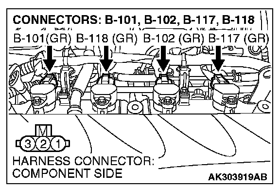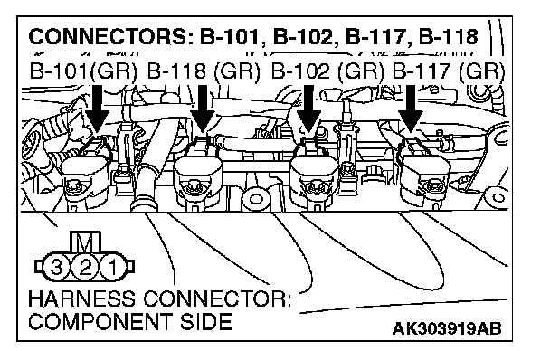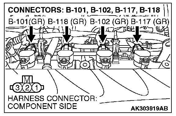 STEP 4. Check the circuit at ignition coil harness side connector B-101, B-102, B-117 and B-118.
