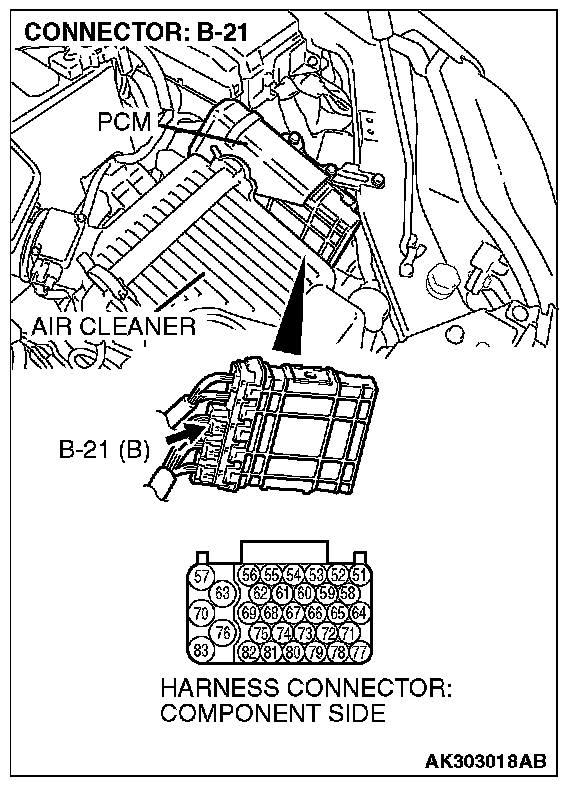 STEP 1. Check harness connector B-21 at PCM for damage.