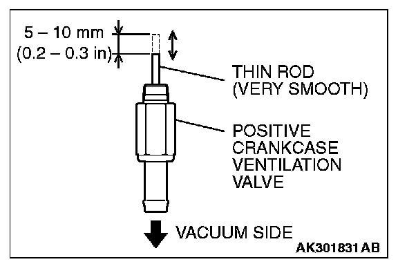 1. Hold the positive crankcase ventilation (PCV) valve with the vacuum side down. Insert a thin rod, and using light pressure, depress the end of the PCV valve spring by 5 - 10 mm (0.2 - 0.3 inch). Release pressure on the rod to see if the PCV valve spring will lift the rod to its original position.