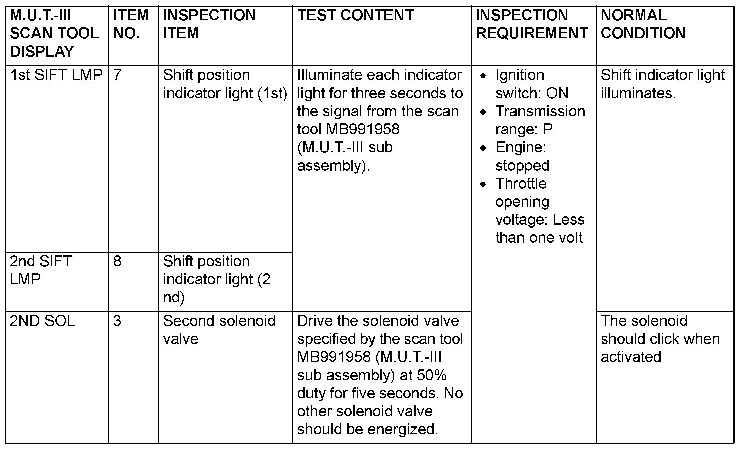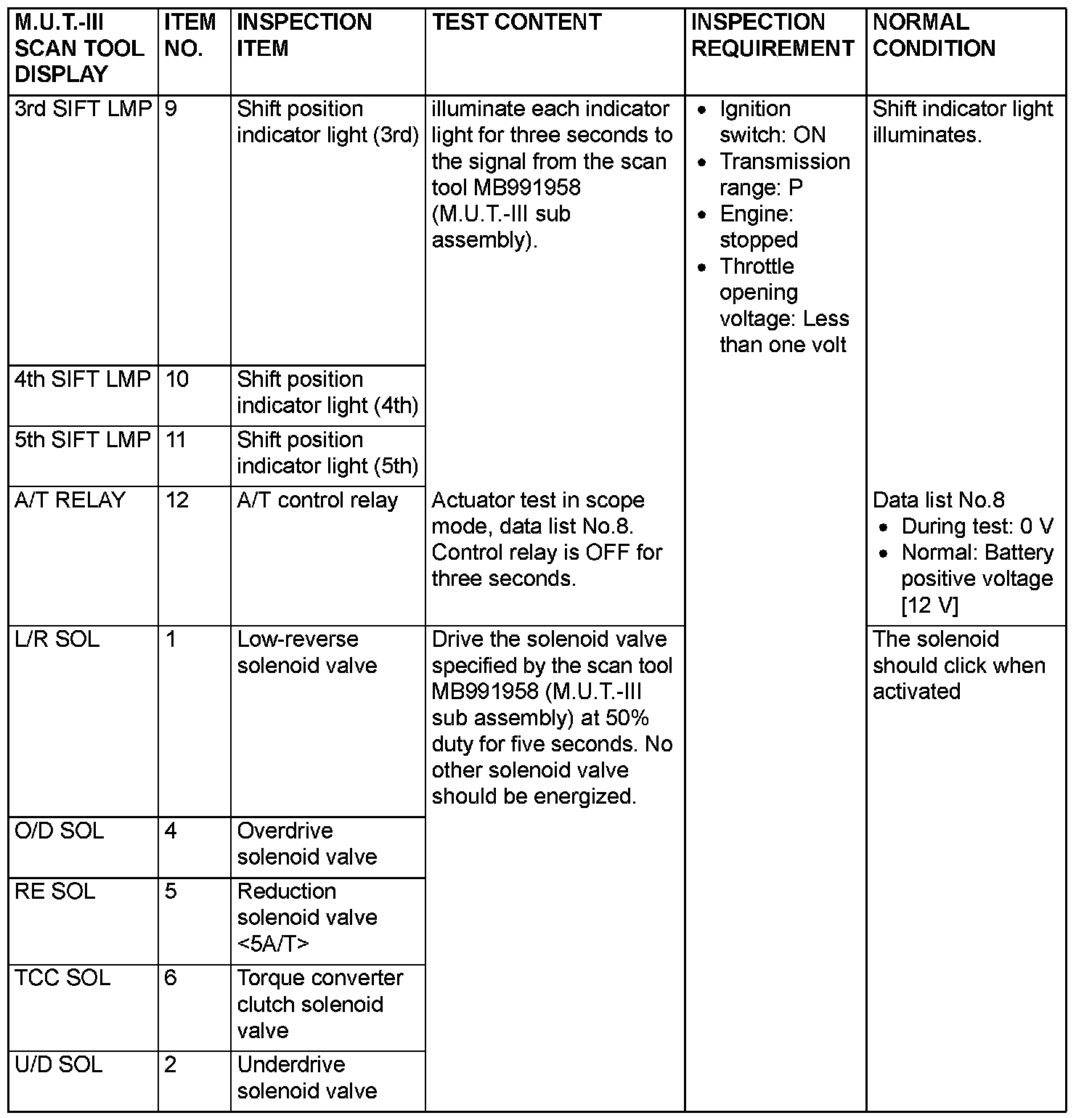 Actuator Test Reference Table