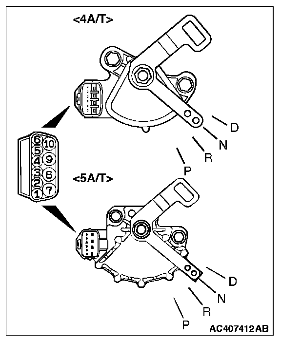 Move the selector lever to each position. The manual control lever position of the transmission range switch should match the transmission range.
