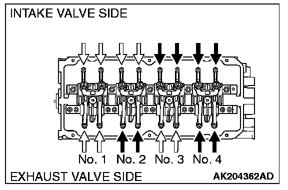 5. Valve clearance inspection and adjustment can be performed on rocker arms indicated by white arrow mark when the No. 1 cylinder piston is at the top dead center on the compression stroke, and on rocker arms indicated by black arrow mark when the No.4 cylinder piston is at the top dead center on the compression stroke.