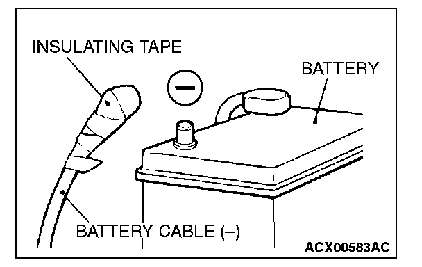 6. Turn the ignition switch to the "LOCK" (OFF) position. Disconnect the negative (-) battery cable and tape the terminal to prevent accidental connection and air bags deployment.