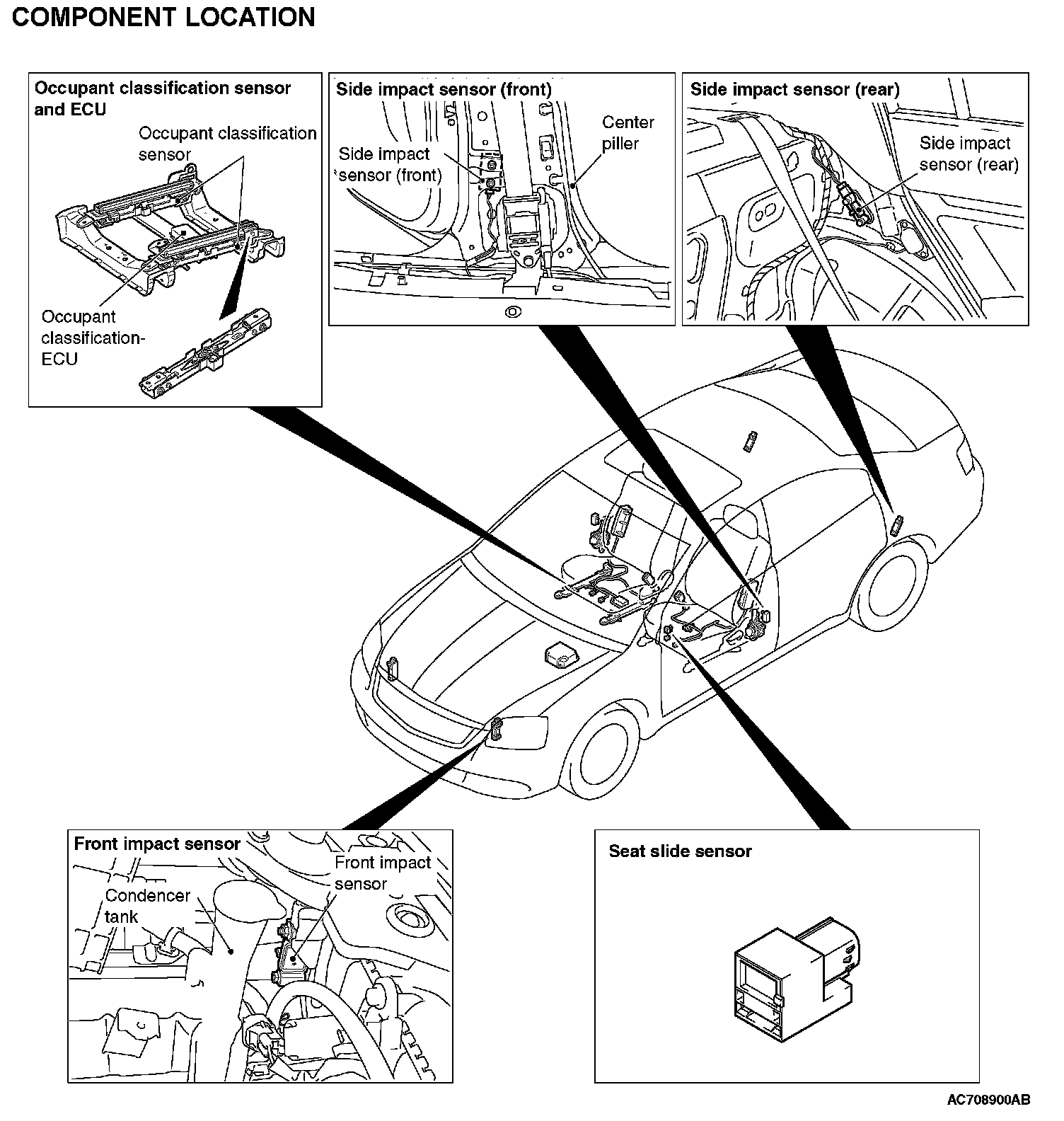 NOTE: The illustration above shows the front impact sensor (LH) and the side impact sensor (Front LH) and the side impact sensor (Rear LH). The position of the front impact sensor (RH) and the side impact sensor (Front RH) and the side impact sensor (Rear RH) is symmetrical to this.