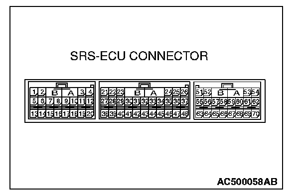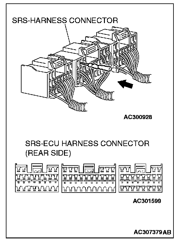 - Inspection of the SRS-ECU connector harness should be carried out by the following procedure. Insert the backprobing tool into connector from harness side (rear side), and connect the tester to backprobing tool. If any tool other than backprobing tool is used, it may cause damage to the harness and other components. Furthermore, measurement should not be carried out by touching the backprobing tool directly against the terminals from the front of the connector. The terminals are plated to increase their conductivity, so if they are touched directly by the backprobing tool, the plating may break, which will decrease reliability.