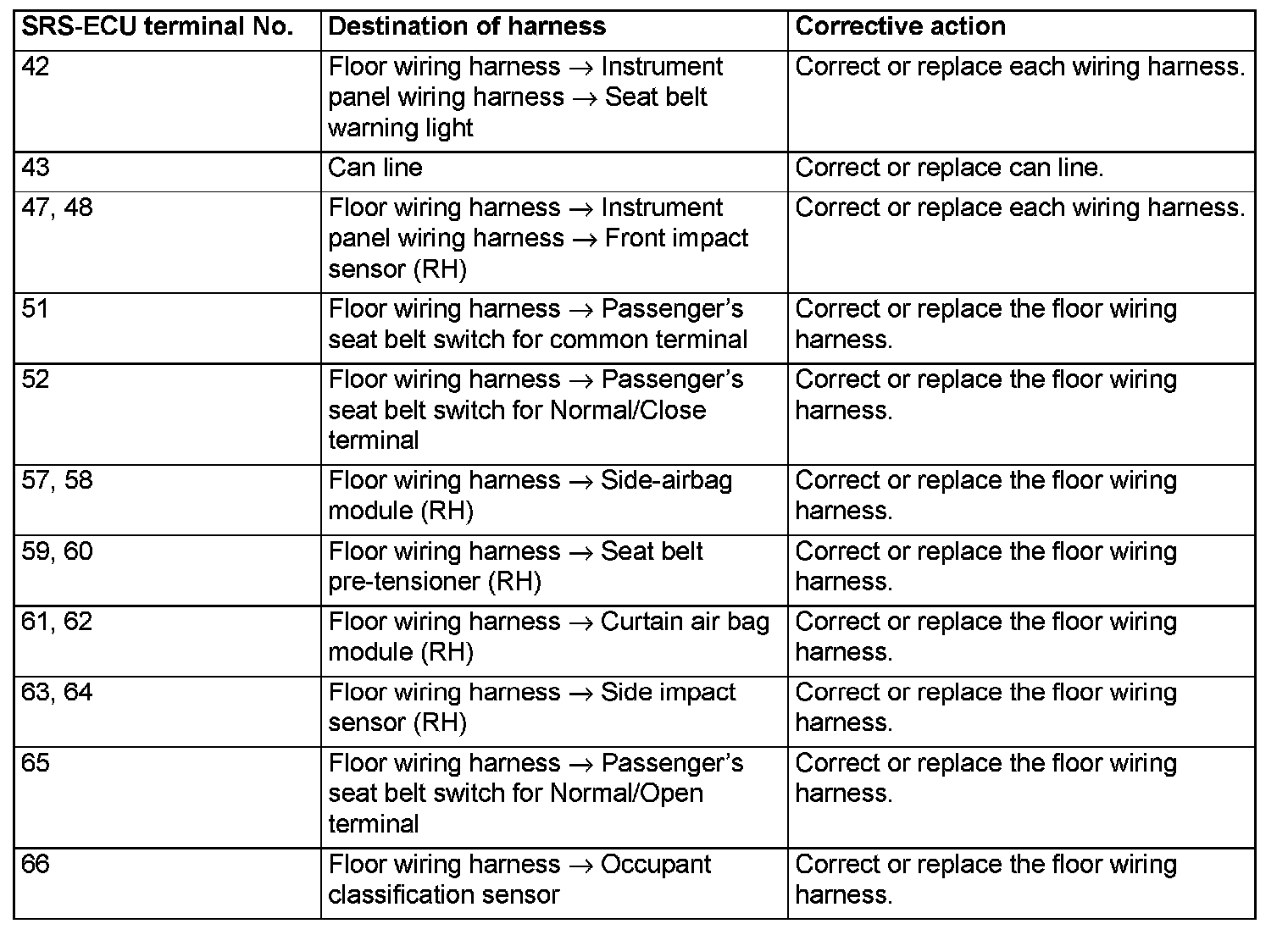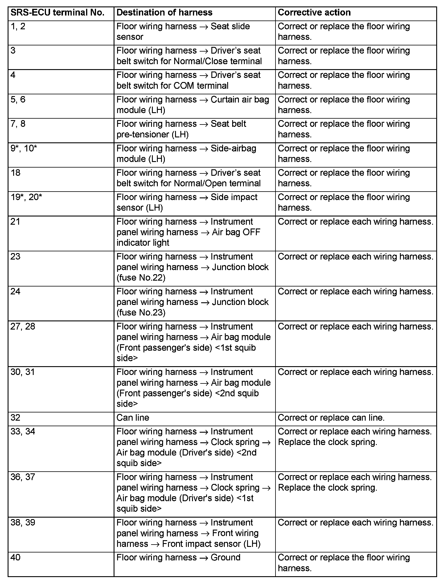 - Do not attempt to repair the wiring harness connectors of the SRS. If any of the connectors are diagnosed as faulty, replace the wiring harness. If the wires are diagnosed as faulty, replace or repair the wiring harness according to the following table.