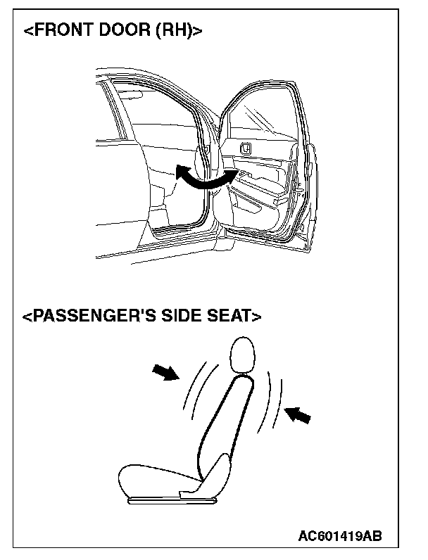 2. Open and close the front door (RH) 5 times hardly to remove the friction. And if the door does not open and close smoothly after the impact, hit the front and rear sides of seatback about 8 times each to remove the friction.