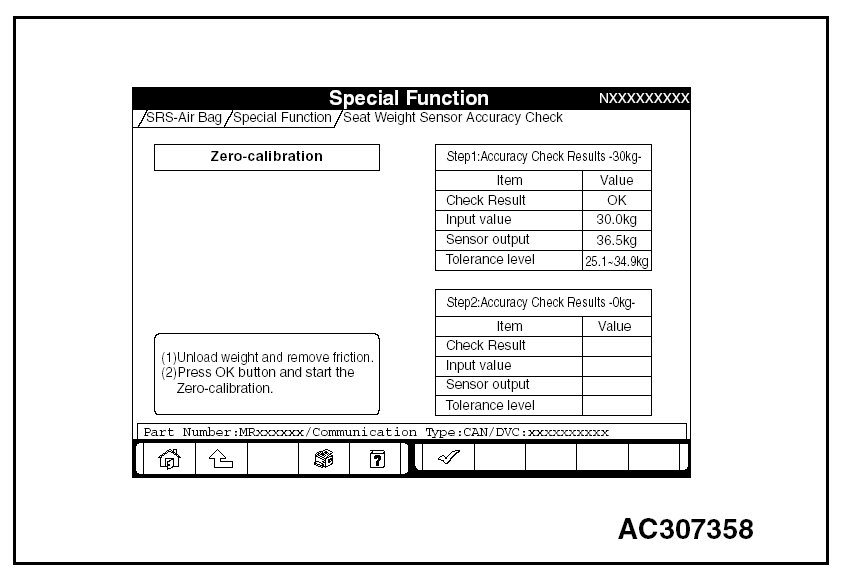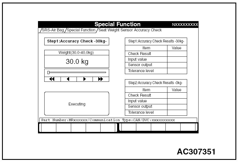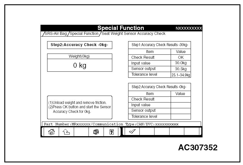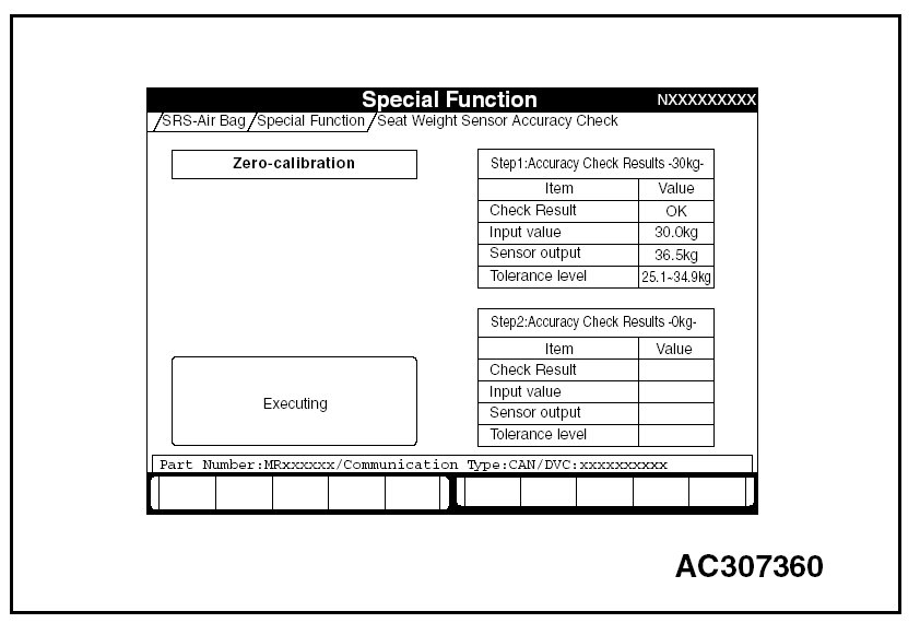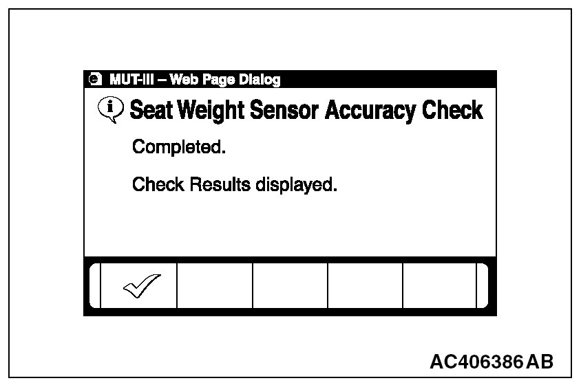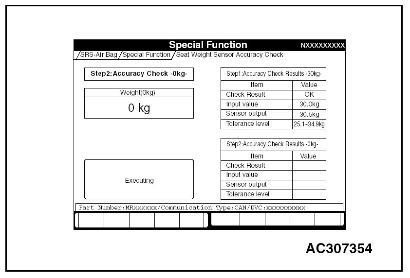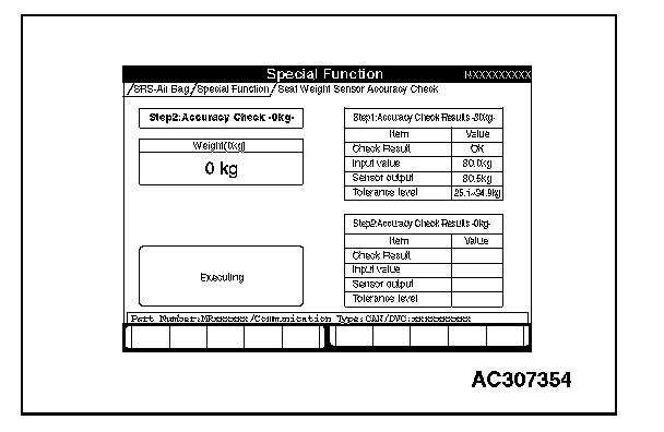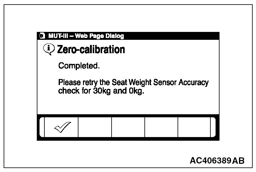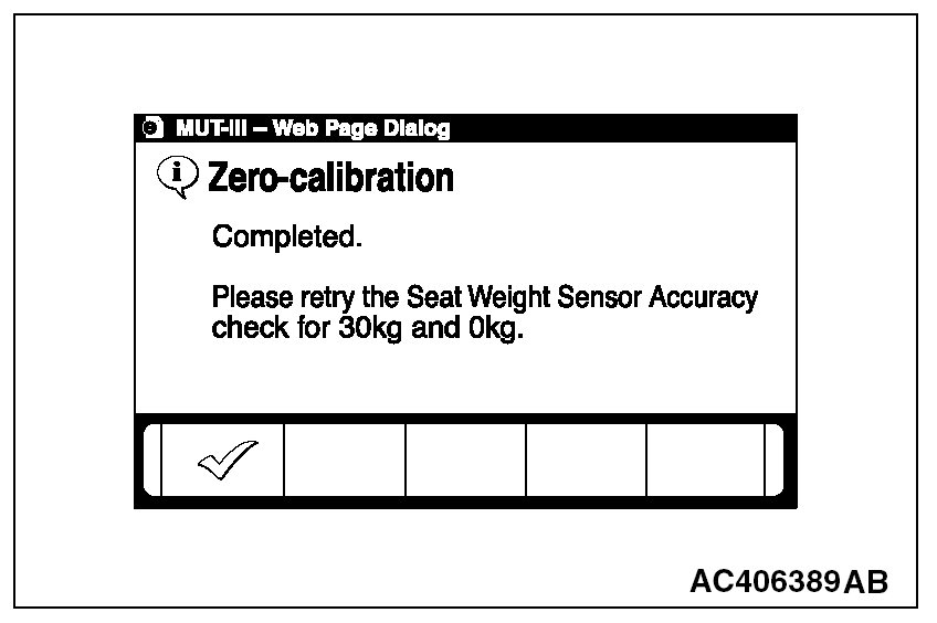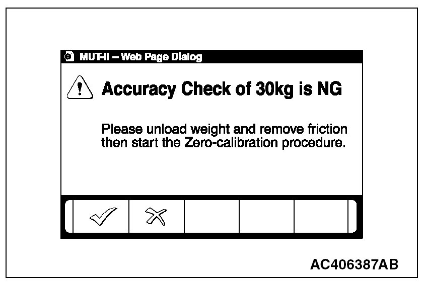 NOTE: When the screen for the accuracy check of 0 kg (0 pound) is displayed, go to step (9). If the abnormal condition is displayed, check the seat installation condition. If the seat is improperly installed, install it properly and carry out the operation in step (4) again.