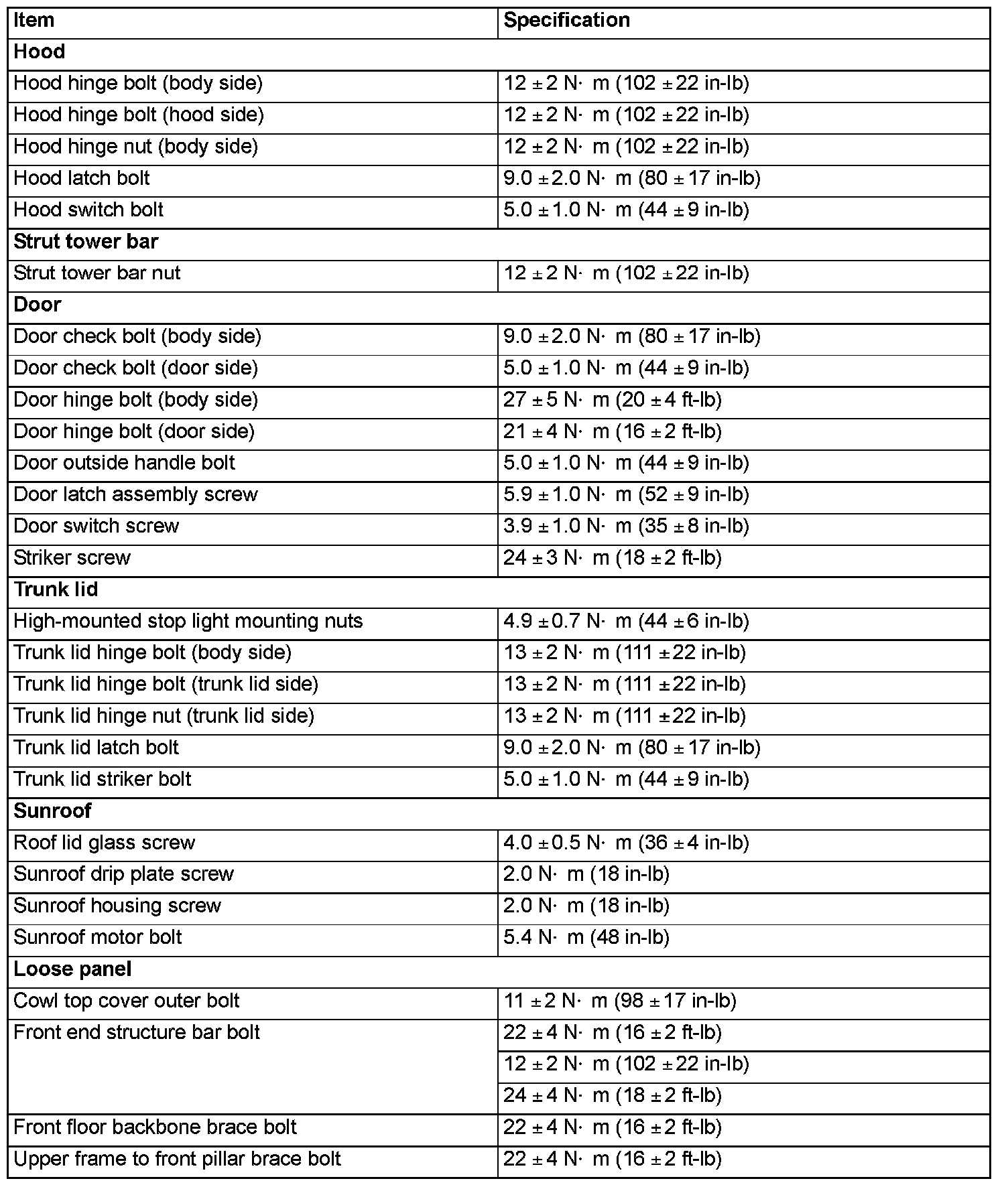 Fastener Tightening Specifications: