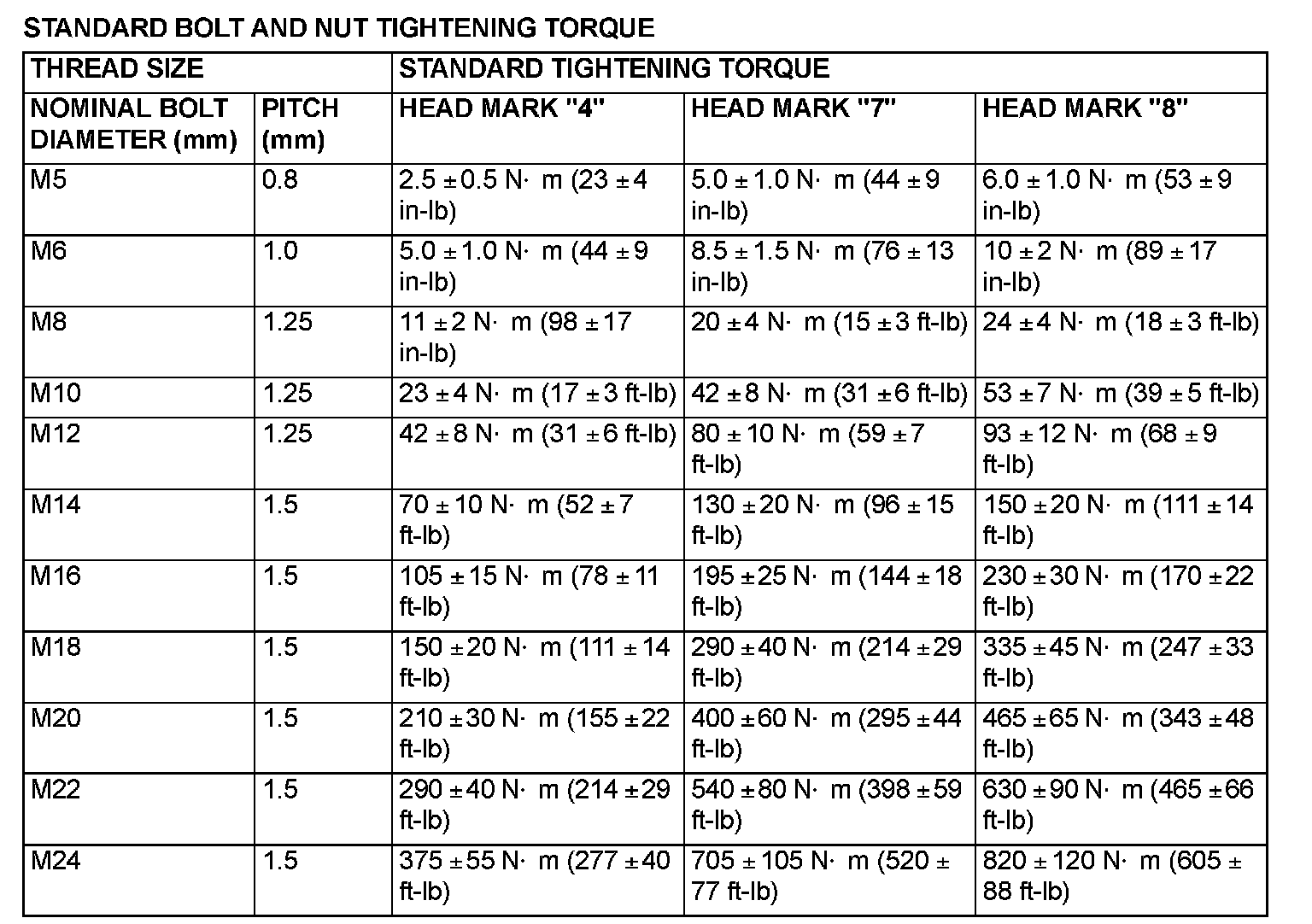STANDARD BOLT AND NUT TIGHTENING TORQUE