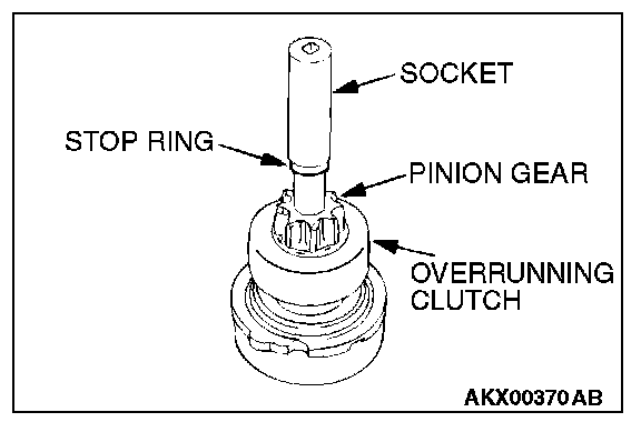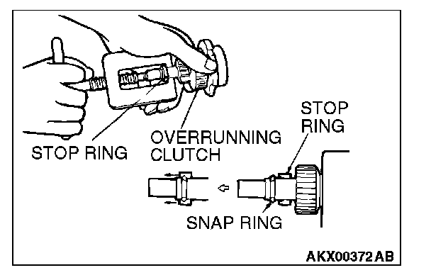 2. After removing the snap ring (by using snap-ring pliers), remove the stop ring and the overrunning clutch.