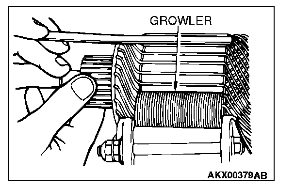 3. Hold a thin steel blade parallel and just above while rotating the armature slowly in the growler. A shorted armature will cause a blade to vibrate and be attracted to the core. Replace the shorted armature.