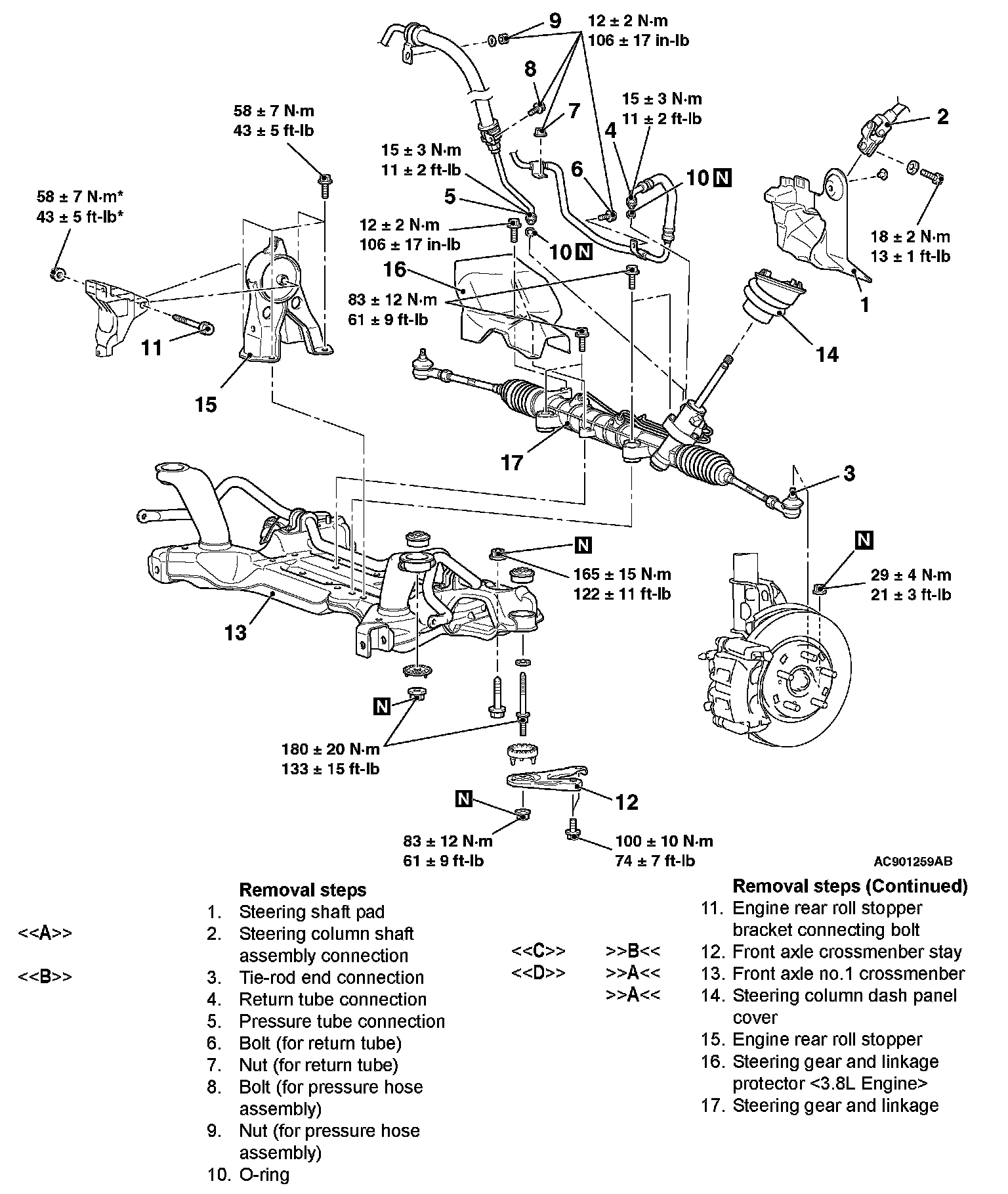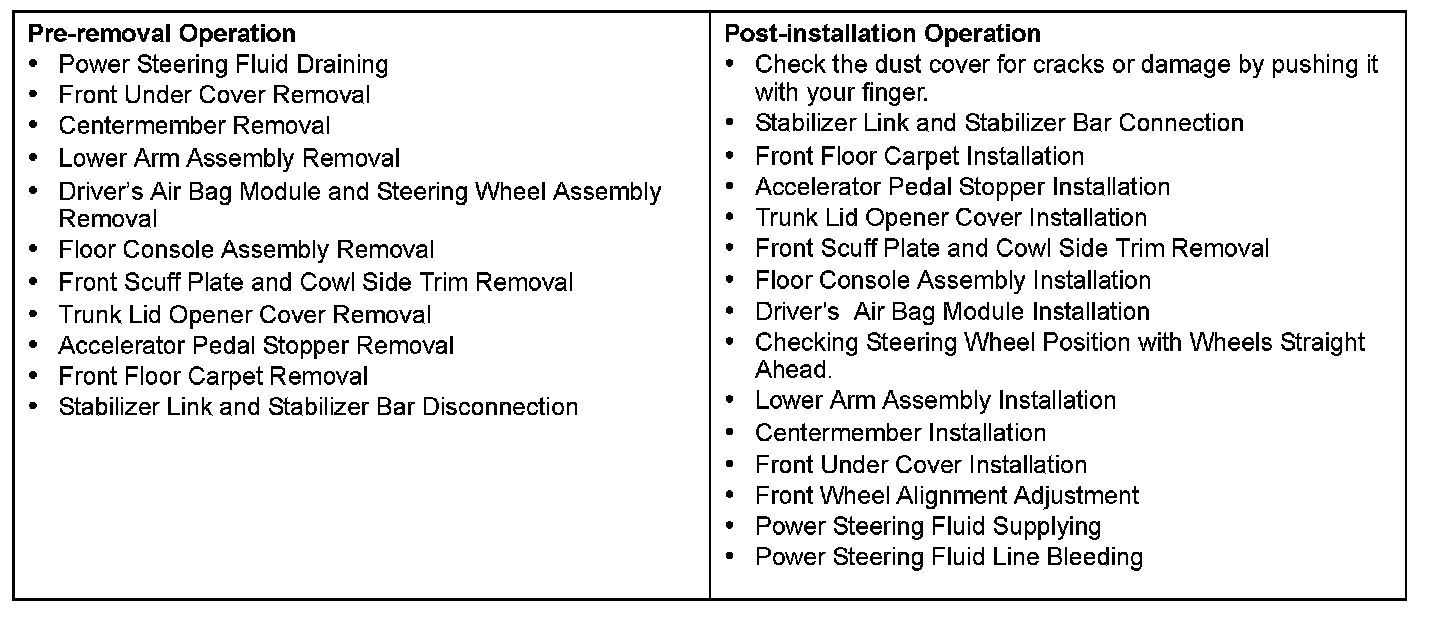 ^ Before removing the power steering gear assembly, refer to Service Precautions and Air Bag Module and Clock Spring.