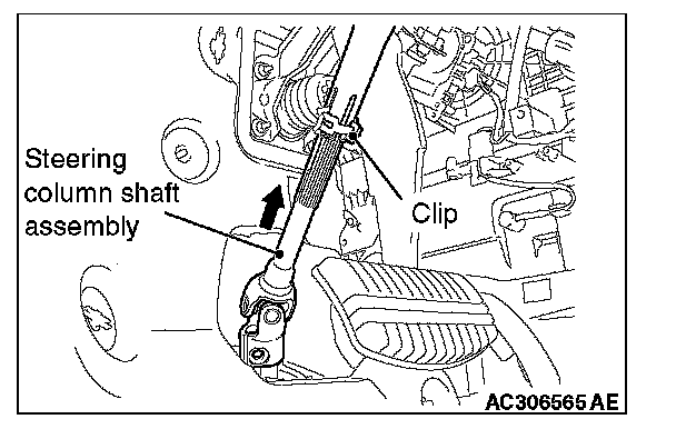 1. Pinch the steering column shaft clip with pliers, and pull up the shaft in the direction shown to disengage the steering column shaft assembly.