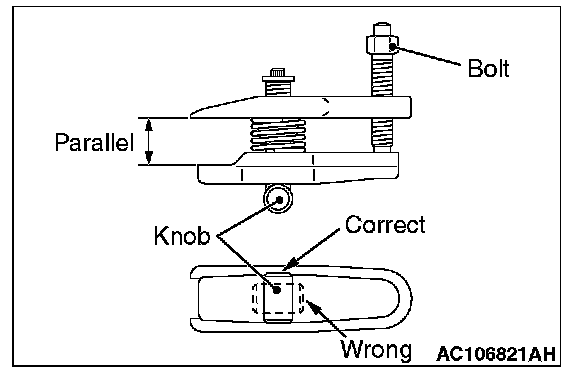 2. Turn the bolt and knob as necessary to make the jaws of special tool MB991897 parallel, tighten the bolt by hand and confirm that the jaws are still parallel.