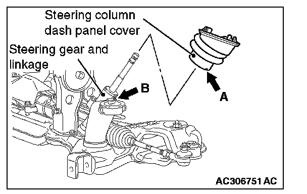 1. Align the steering column dash panel cover notch (arrow A) with the steering gear lug (arrow B), and then install the steering column dash panel cover to the steering gear.