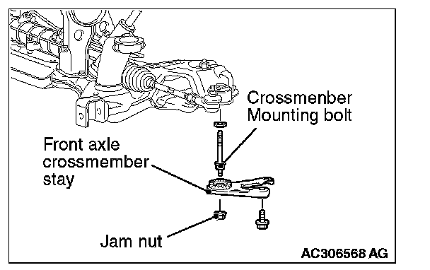 Ensure that the crossmember mounting bolts have been tightened to 180 ± 20 Nm (133 ± 15 ft-lb), and then install the front crossmember stay with the jam nut.