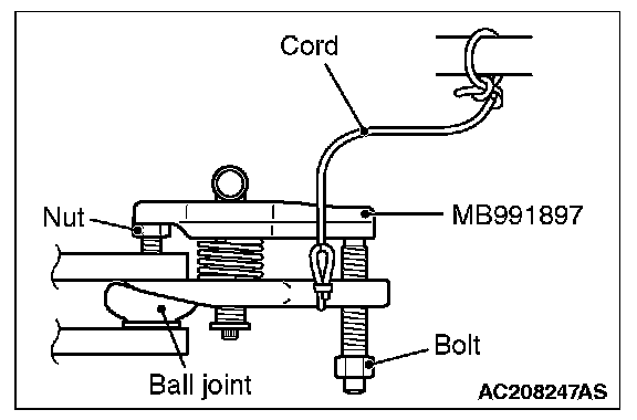 1. Replace the jam nut for lower arm ball joint with a regular nut, because the original one is a little bit large to install the special tool. And then install special tool MB991897 as shown in the figure.