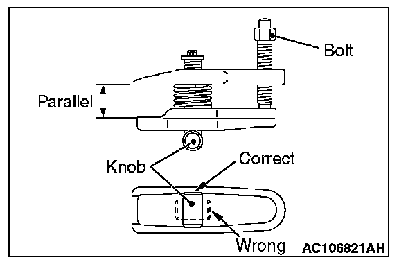 2. Turn the bolt and knob as necessary to make the jaws of special tool MB991897 parallel, tighten the bolt by hand and confirm that the jaws are still parallel.