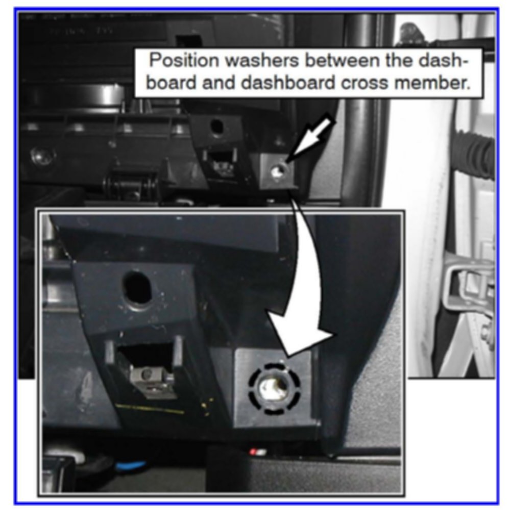 4. Stack 2 standard 6 mm I.D. washers together (approx 4 mm total thickness) and insert them between the dashboard and the dashboard crossmember. They should be centered behind the location for the bolt as shown.