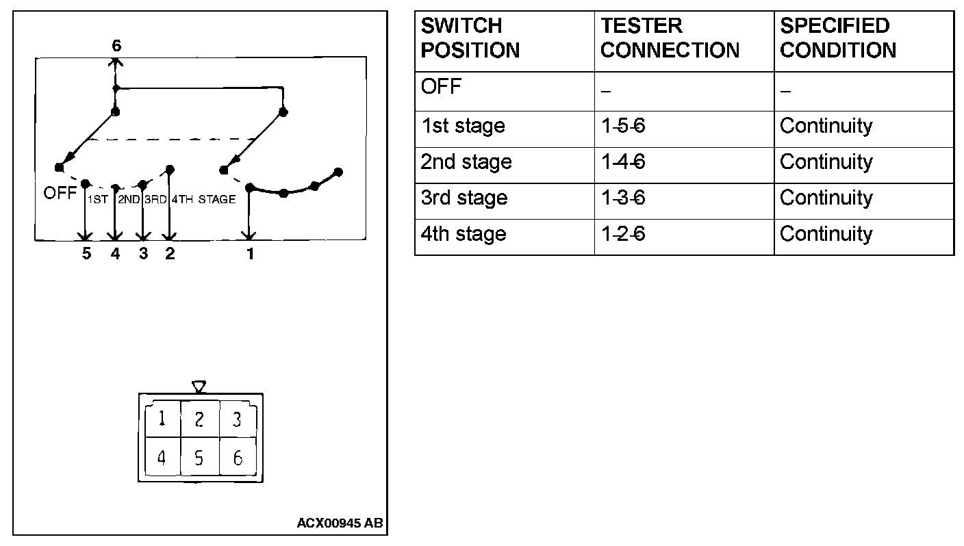 This figure illustrates a complex switch. The continuity between terminals at each position is as indicated in the table below.