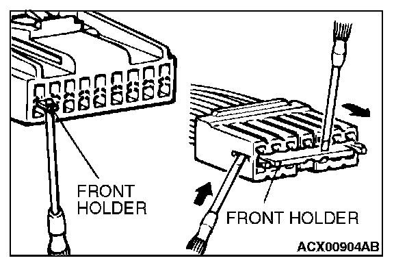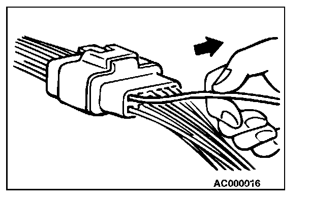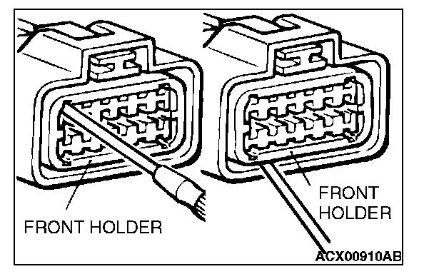 2. If the connector is disconnected for checking and the facing part is the female pin side, use an appropriate male terminal for checking the contact pressure of connector pins (like MB991219).