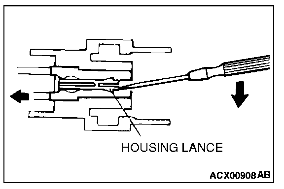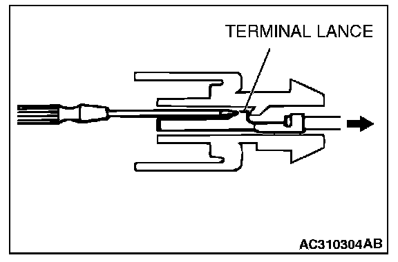 Loosely engaged terminals can be repaired by removing the female terminal from the connector housing and raising its lance to establish better engagement. Removal of the connector terminal used for MFI and INVECS-II A/T control circuit can be done in the following manner.