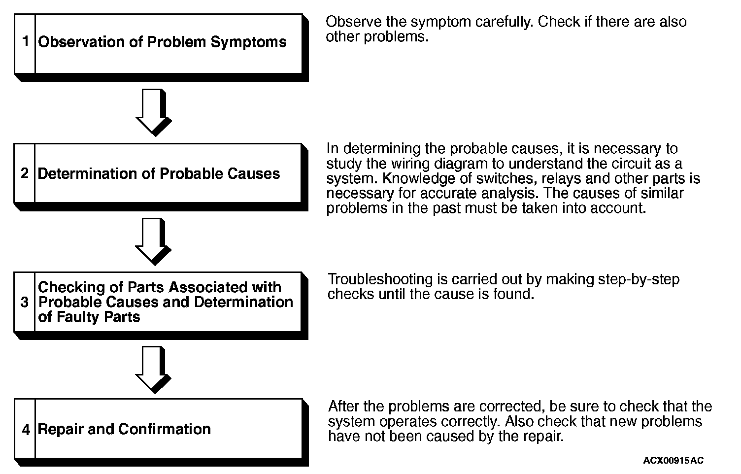 TROUBLESHOOTING STEPSIf an attempt is made to solve a problem without going through correct steps for troubleshooting, the symptoms could become more complicated, resulting in failure to determine the causes correctly and making incorrect repairs. The four steps below should be followed in troubleshooting.