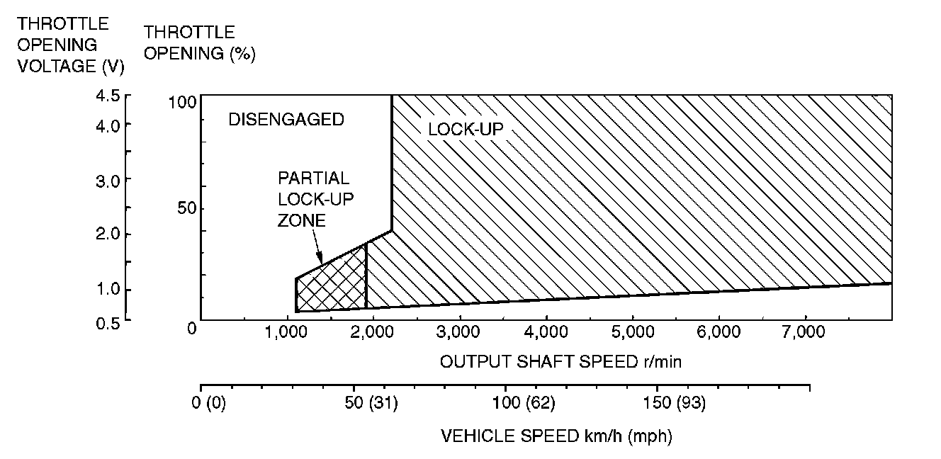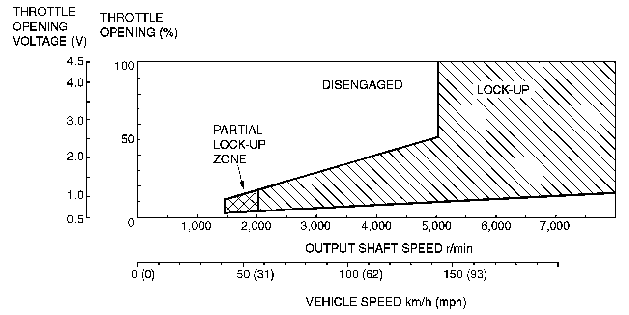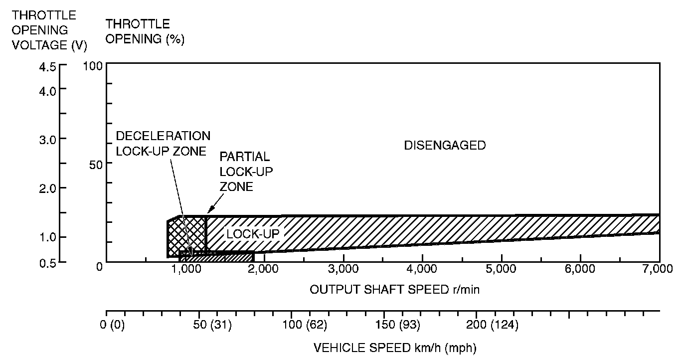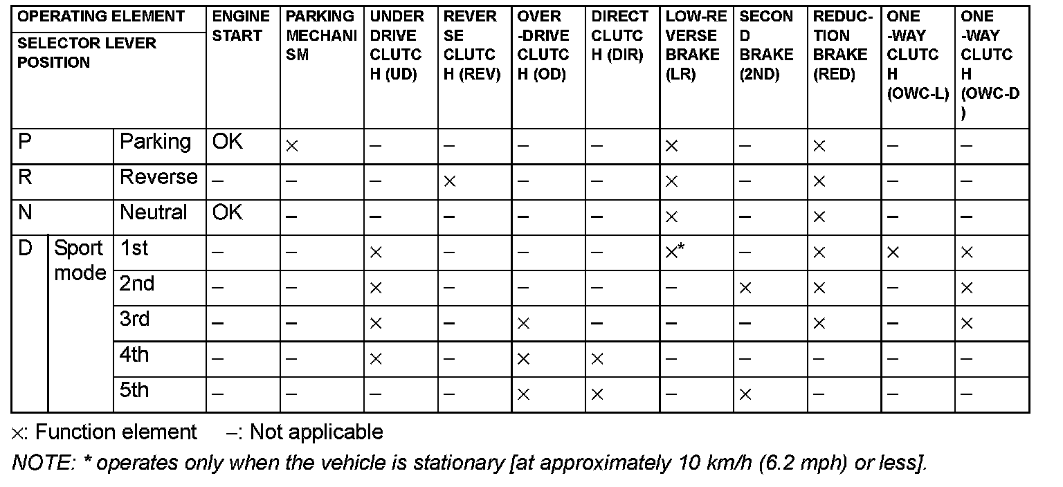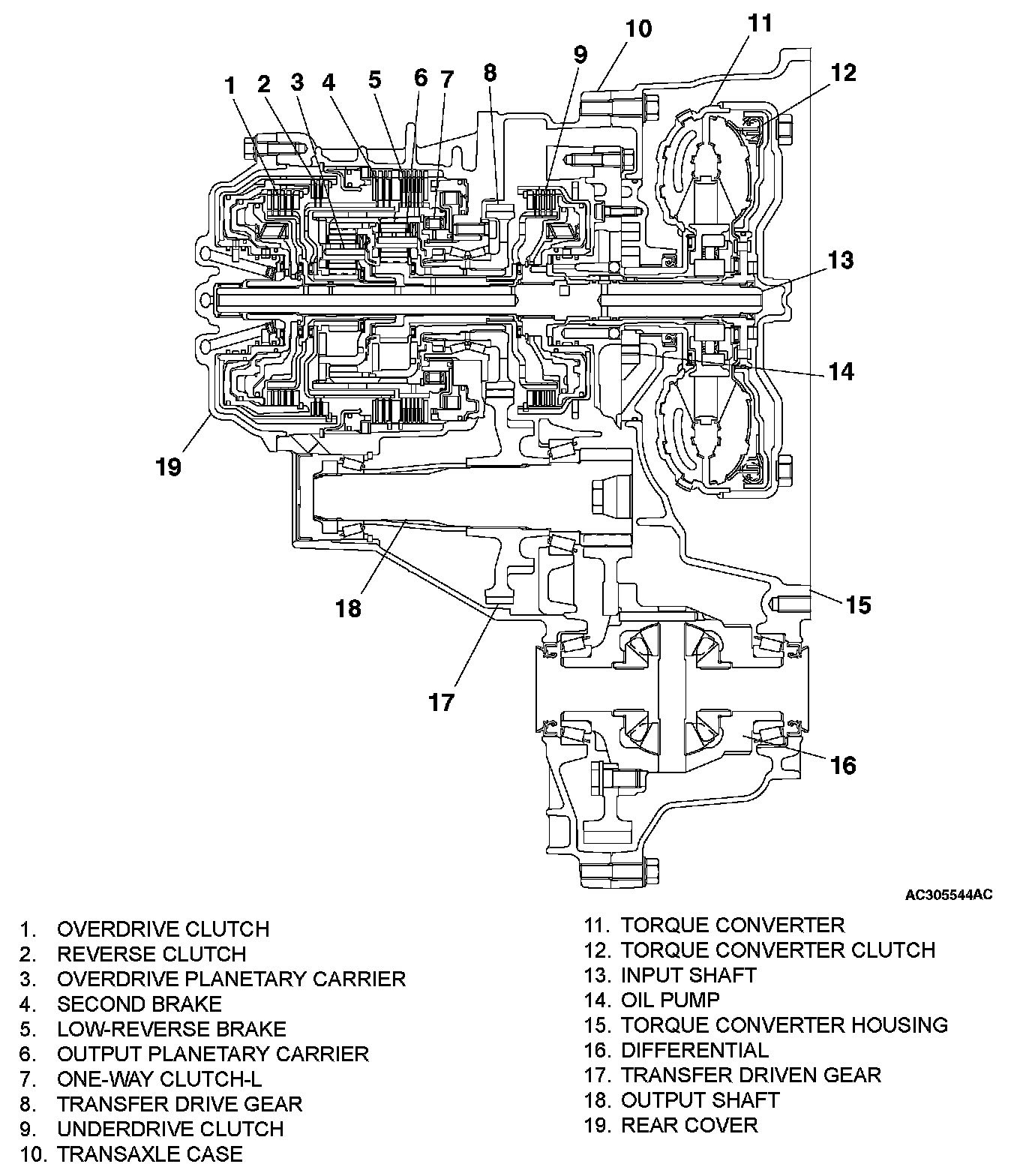 The transaxle is made up of the torque converter and gear train. A 3-element, 1-stage, 2-phase torque converter with built-in torque converter clutch is used. The gear train is made up of four sets of multi-disc clutches, two sets of multi-plate brakes, one set of one-way clutches and two sets of planetary gears. The planetary gears are made up of sun gears, carriers, pinion gears and annulus gears.