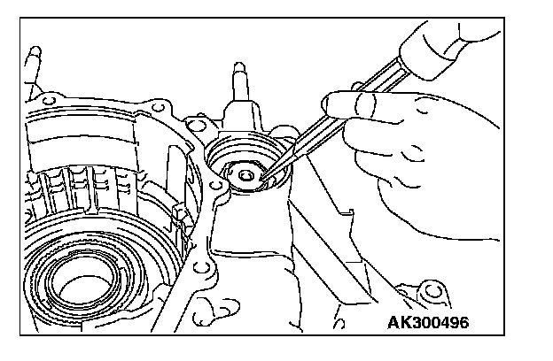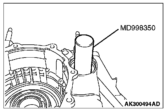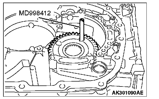 1. Install special tool MD998412 in the installation screw hole of the transfer drive gear bearing located in the transaxle case. Using this as a guide, install the transfer drive gear bearing and gear in the transaxle case.