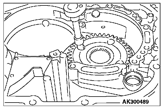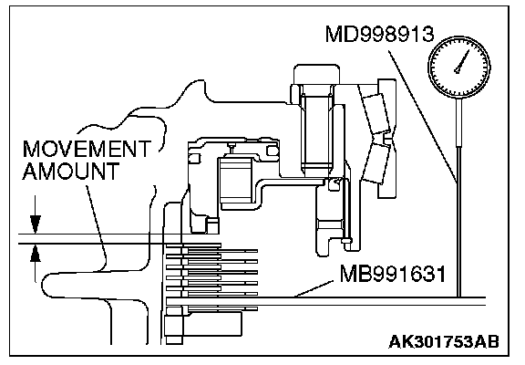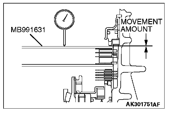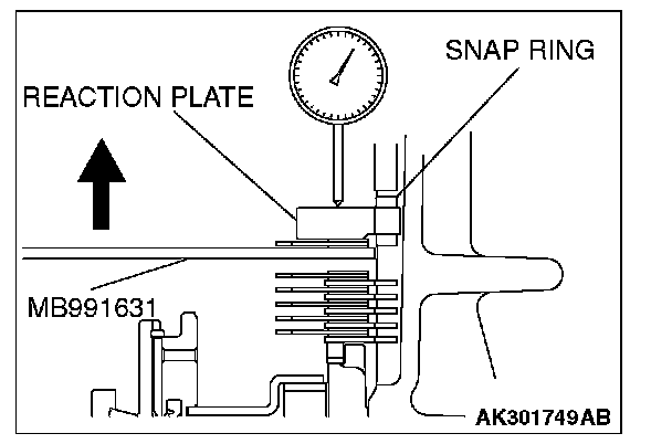 12. Move special tool MB991631 to measure the end play of reaction plate. Then replace the snap ring installed in step 11 to adjust the end play to standard value.