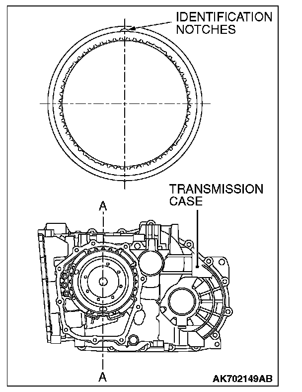 5. Check where the identification notches of the one-way clutch inner race are. Install the one-way clutch inner race to the transfer drive gear bearing so that either of the identification notches can be located on the line A - A.